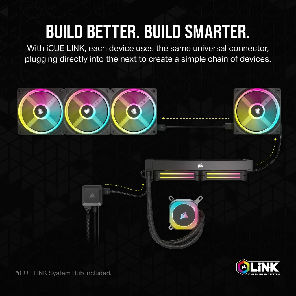 iCUE LINK LÀ GÌ?XÂY DỰNG TỐT HƠN, THÔNG MINH HƠN.iCUE Link là một công nghệ đột phá sử dụng một cáp duy nhất giúp xây dựng một PC tự lắp ráp theo cách hoàn toàn mới. Công nghệ này tự động phát hiện và cấu hình các quạt PC, bộ làm mát CPU và các linh kiện nội bộ khác của bạn.