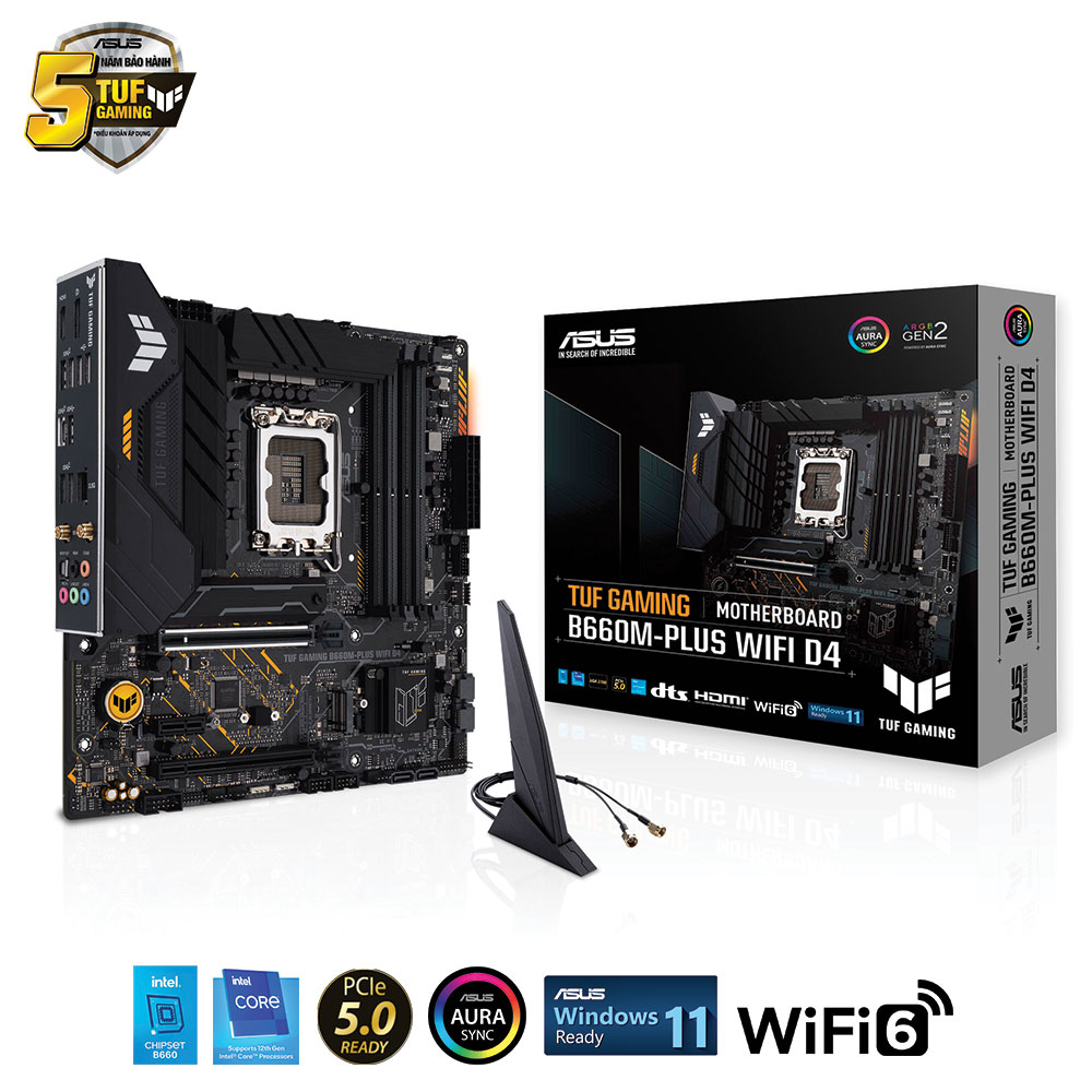 Asus TUF GAMING B660M-PLUS WIFI là dòng bo mạch chủ chipset B660 tầm trung, phù hợp với các vi xử lý Pentium, Celeron,i3 & i5 hoặc i7,i9 non K thế hệ Alder Lake.