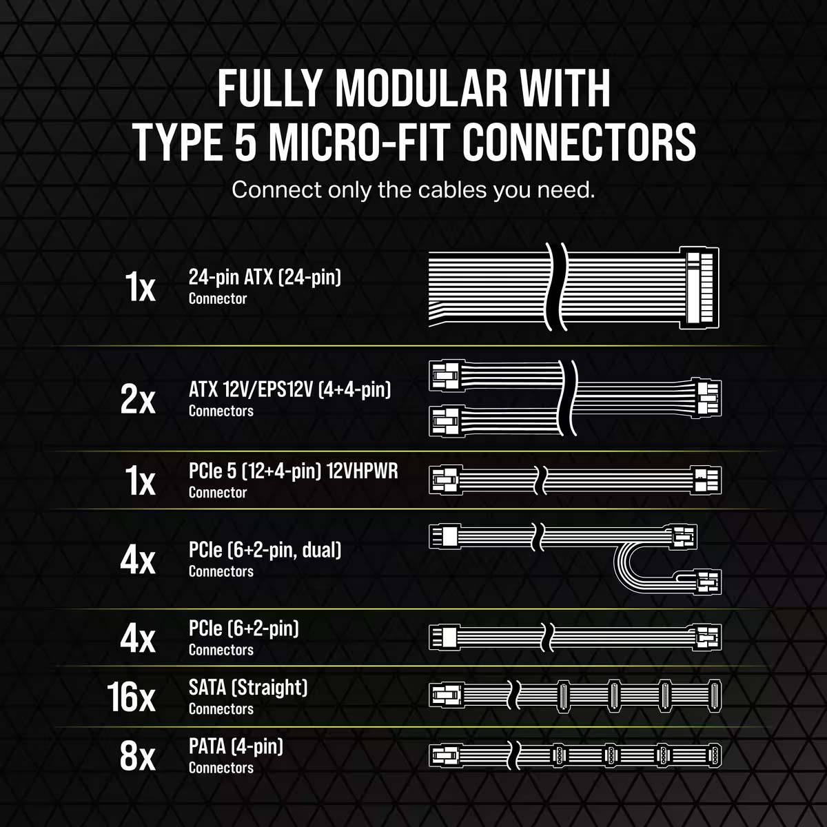 Cáp PSU micro-fit CORSAIR Type 5 Gen 1 hoàn toàn theo mô-đun, vì vậy bạn chỉ kết nối các loại cáp mà hệ thống của bạn cần trong khi chiếm ít không gian hơn.