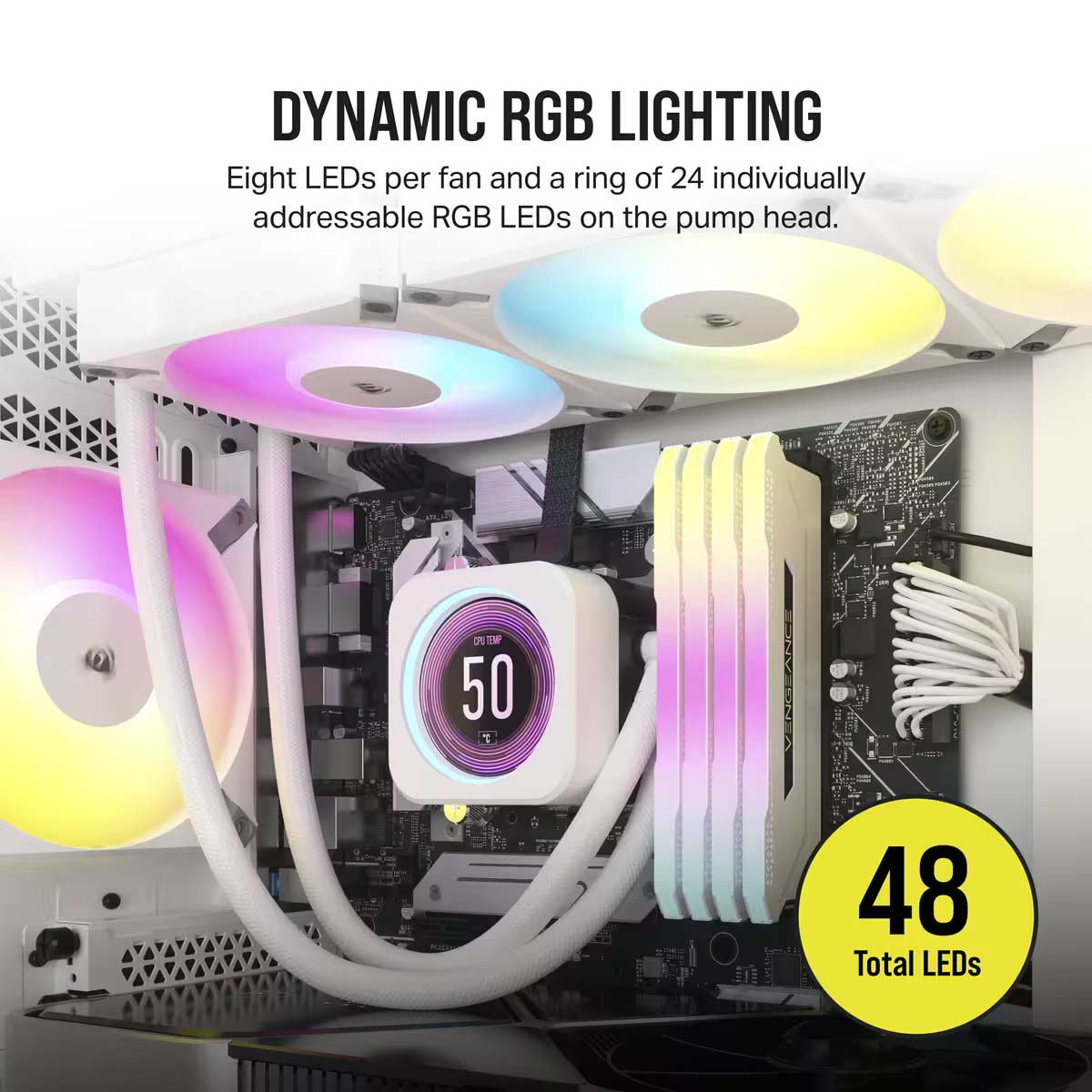 | Đầu bơm hiệu suất cao với vòng đèn LED RGBĐừng hy sinh hiệu suất để điều chỉnh nhiệt. Đầu bơm mạnh mẽ, ít tiếng ồn đảm bảo bạn có thể vắt kiệt từng MHz cuối cùng của các CPU tương thích.